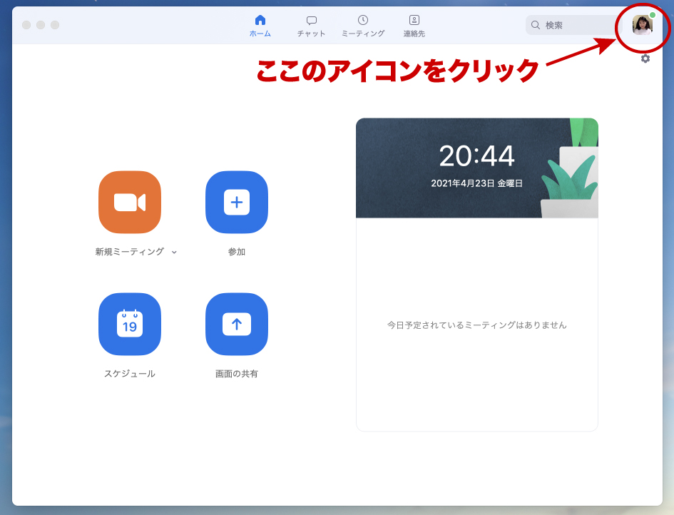 Zoomアプリを立ち上げ、ホーム画面の右上にあるアカウントのアイコンをクリックする。